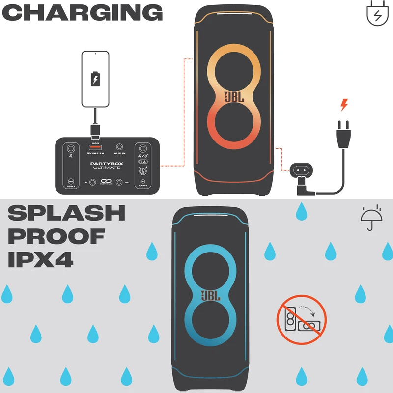 برخلاف بسیاری از مدلهای کوچکتر PartyBox، مدل Ultimate فاقد باتری داخلی است و برای تامین انرژی عظیم ۱۱۰۰ واتی خود، به اتصال مستقیم به برق شهری نیاز دارد. این تصمیم با توجه به قدرت بسیار بالای دستگاه، کاملا منطقی و قابل درک است و تضمین میکند که اسپیکر بتواند بدون هیچگونه محدودیتی از نظر توان، بهترین عملکرد خود را در طولانیترین مهمانیها ارائه دهد. کابل برق همراه دستگاه طولی حدود ۲ متر دارد.