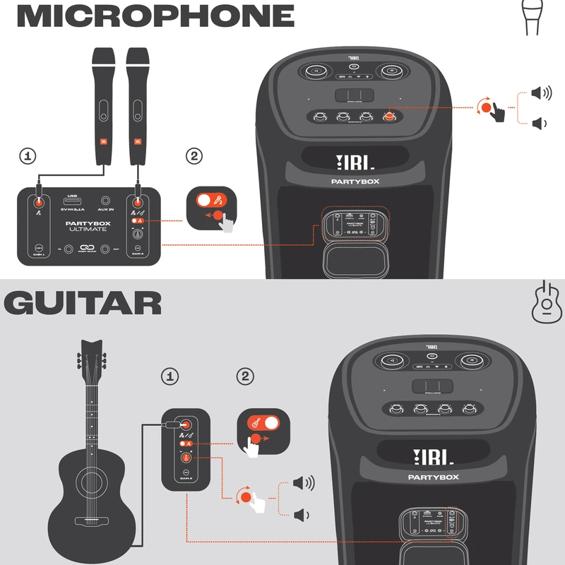 جیبیال با تعبیهی پنل JBL PartyPad در قسمت بالایی اسپیکر، سطح جدیدی از تعامل و سرگرمی را به مهمانیها اضافه کرده است. این پنل لمسی و نوآورانه به کاربران اجازه میدهد تا با حرکات سادهی ضربه زدن، نگه داشتن یا کشیدن انگشت، افکتهای صوتی DJ-گونه و جذاب را به موسیقی در حال پخش اضافه کنند، نورپردازی را به صورت آنی کنترل نمایند و به نوعی، خودشان هم در خلق اتمسفر مهمانی مشارکت داشته باشند. برای علاقهمندان به خوانندگی، نوازندگی و اجراهای زنده، PartyBox Ultimate به دو ورودی میکروفون و یک ورودی گیتار مجهز است. این ورودیها دارای تنظیمات تخصصی و دقیقی برای کنترل گین، اکو و سایر پارامترهای صدا هستند که به شما اجازه میدهند تا صدای دلخواه خود را برای اجرای کارائوکه، خوانندگی یا نواختن گیتار تنظیم کنید. این قابلیت، PartyBox Ultimate را به یک سیستم PA قابل حمل و حرفهای تبدیل میکند که برای هر نوع اجرایی آماده است.
