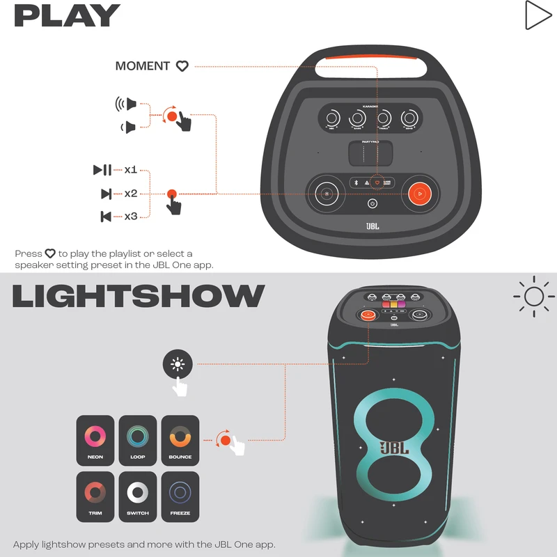 صوتی بسیار قدرتمند و هماهنگ را برای پوشش فضاهای بسیار بزرگ یا ایجاد صدای استریوی واقعی ایجاد کنید. کنترل کامل تمام این امکانات، از تنظیمات اکولایزر و نورپردازی گرفته تا افکتهای صوتی و بهروزرسانی فریمور، از طریق اپلیکیشن JBL One برای دستگاههای اندرویدی و iOS امکانپذیر است.
