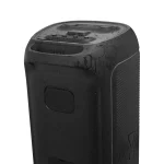 PartyBox Ultimate با ابعاد ۴۵۵ در ۱۰۴۹ در ۴۴۰ میلیمتر و وزن قابل توجه ۳۹.۵ کیلوگرم، حضوری قدرتمند و مسلط دارد. بدنهی این اسپیکر از پلاستیک فشرده و بسیار مقاوم ساخته شده که دوام بالایی را در برابر شور و هیجان مهمانیها و جابجاییهای متعدد تضمین میکند. با وجود این ابعاد و وزن، جیبیال با هوشمندی، یک دستگیرهی ارگونومیک و بسیار محکم، به همراه چرخهایی روان و تقویتشده در قسمت پایینی دستگاه تعبیه کرده است. این ترکیب، جابجایی این غول صوتی را به طرز شگفتآوری آسان و بیدردسر میکند و به شما اجازه میدهد تا صحنهی اجرای خود را به هر مکانی، از داخل خانه گرفته تا فضای باز، منتقل کنید. این اسپیکر همچنین دارای گواهینامهی IPX4 است که مقاومت آن را در برابر پاشش آب از هر جهتی تضمین میکند. این ویژگی، خیالی آسوده را برای استفاده از آن در کنار استخر، مهمانیهای ساحلی یا حتی در شرایط آب و هوایی غیرمنتظره فراهم میکند و به شما اجازه میدهد تا بدون نگرانی، از موسیقی و جشن خود لذت ببرید.