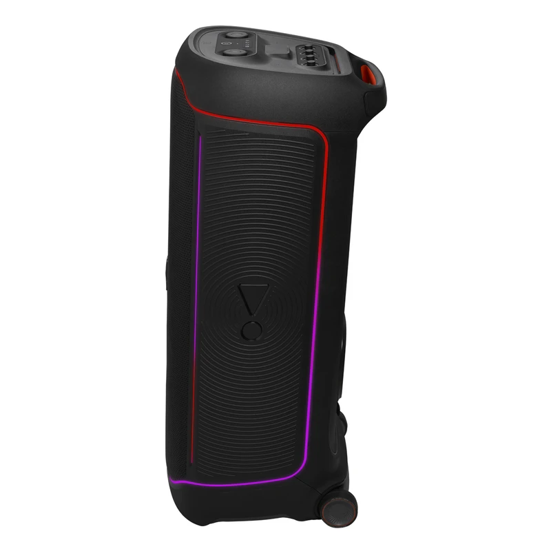 قلب تپندهی PartyBox Ultimate، سیستم صوتی فوقالعاده قدرتمند و پیشرفتهی آن است. این دستگاه به دو سابووفر عظیم ۲۴۲ میلیمتری یا همان ۹ اینچی که بیسهایی عمیق و کوبنده را تولید میکنند، دو بلندگوی میدرنج ۱۲۰ میلیمتری یا ۴.۵ اینچی برای ارائهی وکال و فرکانسهای میانی شفاف و دقیق، و دو توییتر ۷۴ میلیمتری یا ۲.۷۵ اینچی برای پخش فرکانسهای بالای کریستالی و بدون اعوجاج مجهز شده است. این مجموعهی حرفهای از درایورهای بهبودیافته، در کنار هم، توان خروجی واقعی و شگفتانگیز ۱۱۰۰ وات RMS را تولید میکنند که صدایی با امضای افسانهای JBL Pro Sound، یعنی قدرتمند، غنی، با جزئیات کامل و تفکیکپذیری بالا را به گوش شما میرساند. بازهی فرکانسی قابل پخش در این سیستم صوتی، از ۳۰ هرتز تا ۲۰ کیلوهرتز است که پوشش کاملی از تمام نتهای موسیقی را تضمین میکند.