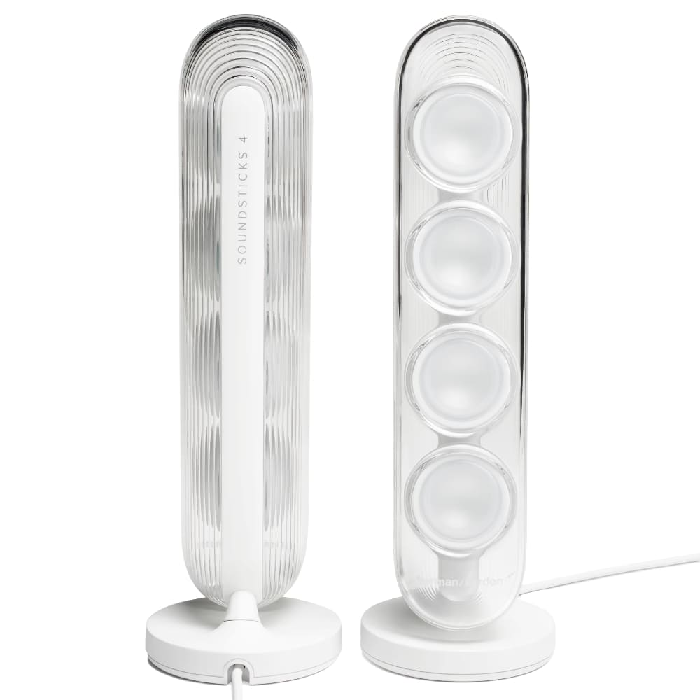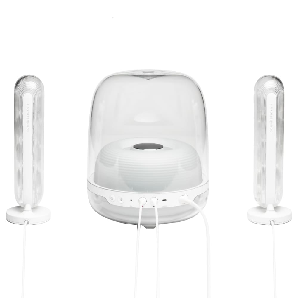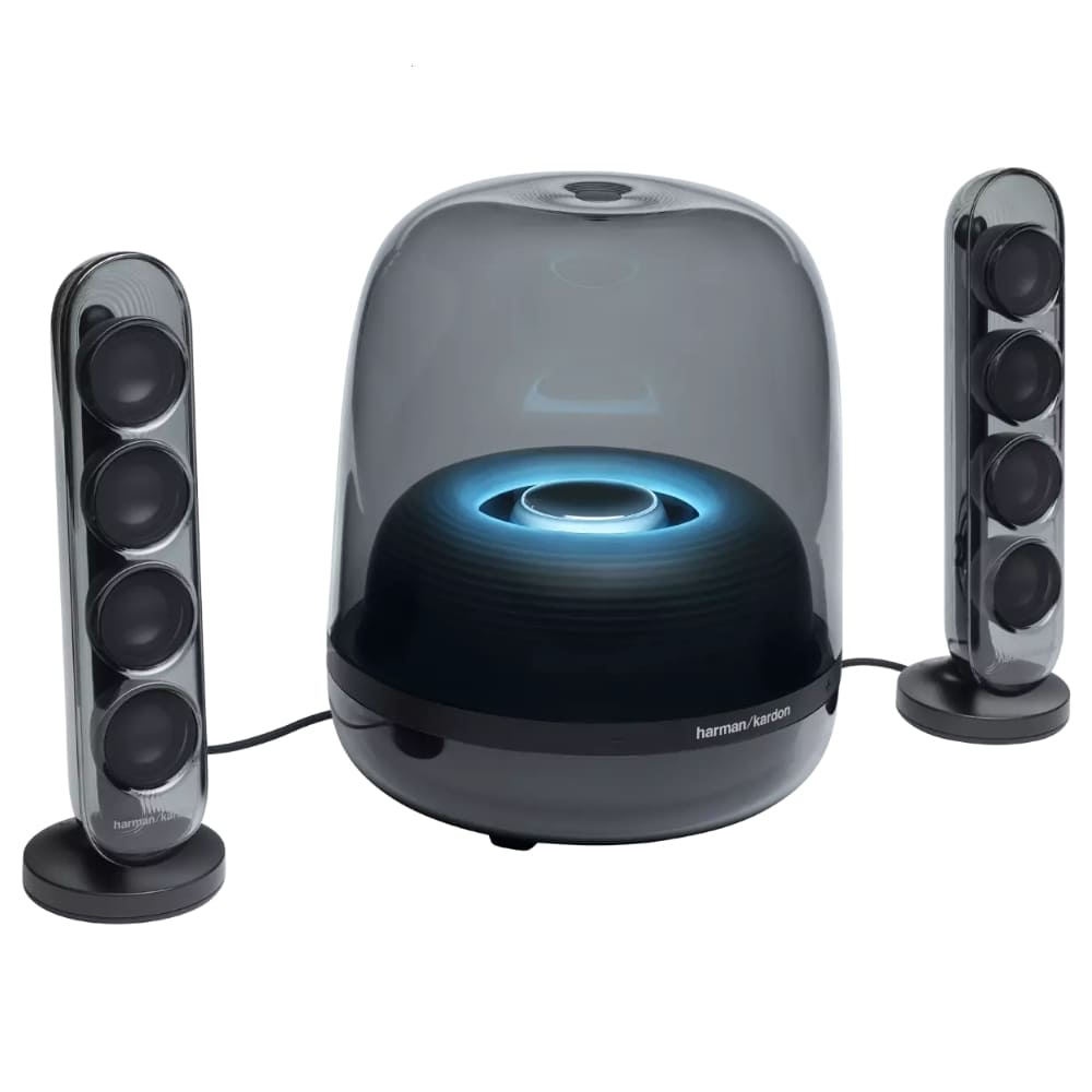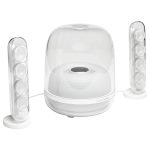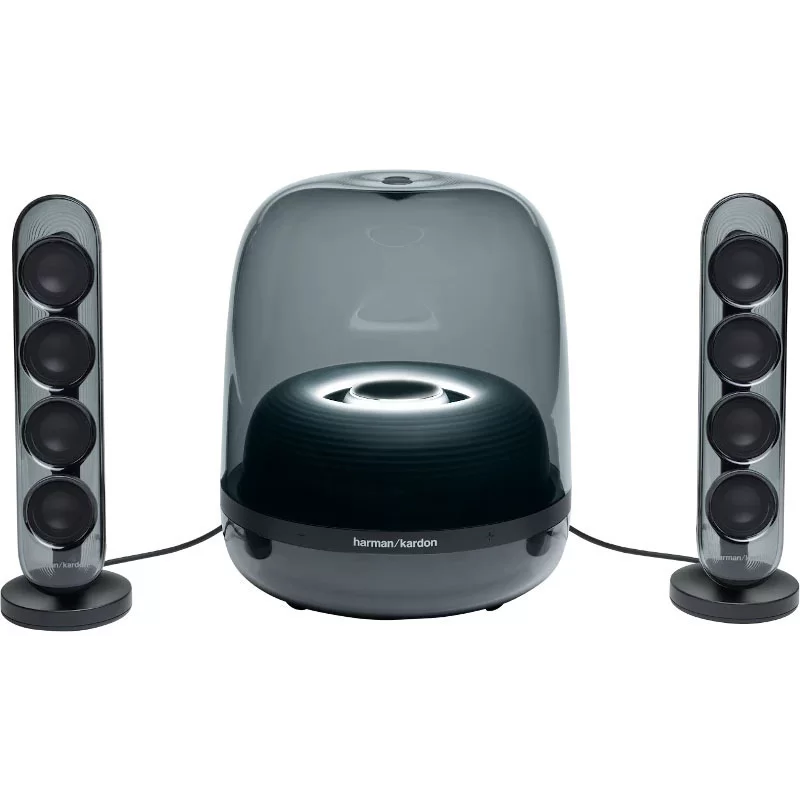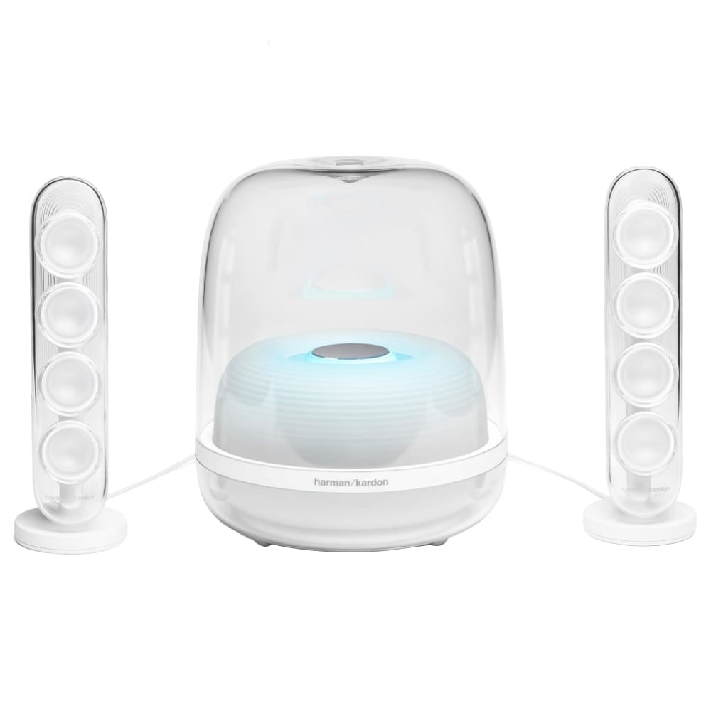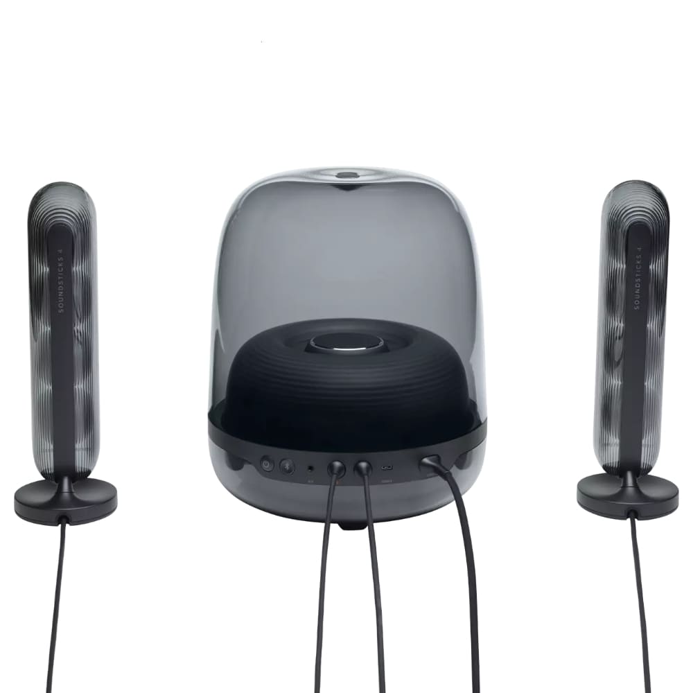 اسپیکر Harman Kardon SoundSticks 4 یکی از اسپیکرهای محبوب برند هارمن کاردن میباشد که یک سیستم صوتی خانگی 2.1 کانال است. اسپیکر بلوتوثی Harman Kardon SoundSticks 4 از دو عدد اسپیکر سَتِلایت (Satellite) و یک عدد سابووفر اِکسترنال (External) تشکیل شده است و دارای طراحی بسیار زیبا و چشمگیری میباشد. بدنه این اسپیکر حالت شیشهای دارد، به صورتی که اجزای داخل آن کاملا پیداست، همین سبک طراحی این اسپیکر را خاص و جذاب کرده است.